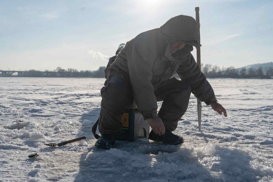 Oleksandr, 65, grips a long ice pick in his hands and slams it down with all his strength onto the frozen surface. “In some places, there are six meters of ice,” he breathes between strikes. “Once the hole is dug, you drop the hook, and you wait for a fish.”
