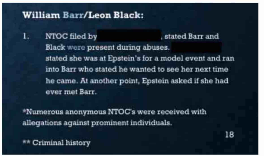 NTOC filed by [REDACTED] stated Barr and Black were present during abuses. [REDACTED] stated she was at Epstein’s for a model event and ran into Barr who stated he wanted to see her next time he came. At another point, Epstein asked if she had ever met Barr.
