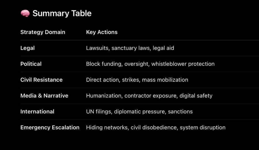 This is not about normal disagreement over policy — it is about resisting a potentially genocidal political project using the machinery of the state. Strategies must combine principled nonviolence, mass resistance, and institutional disruption, and they must begin before the machinery is fully operational.